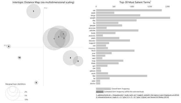 We used exploratory topic modeling and manual coding to analyze user-created threads posted in the social forum of a diet and fitness app. 1,941 threads were captured using a keyword search for eating disorder terms (“eating disorder,” “anorexia/anorexic,””binge eating disorder,” “bulimia/bulimic” and “EDNOS”).