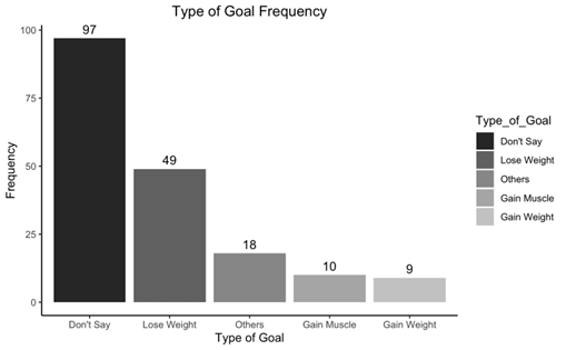 Our coding primarily sought to identify the health goals of users who have experienced an eating disorder. Users in our sample largely did not mention a specific health goal. Of those that did, losing weight was most common, followed by other health goals unrelated to their weight or fitness, then gaining muscle. Wishing to gain weight was the least common goal.
